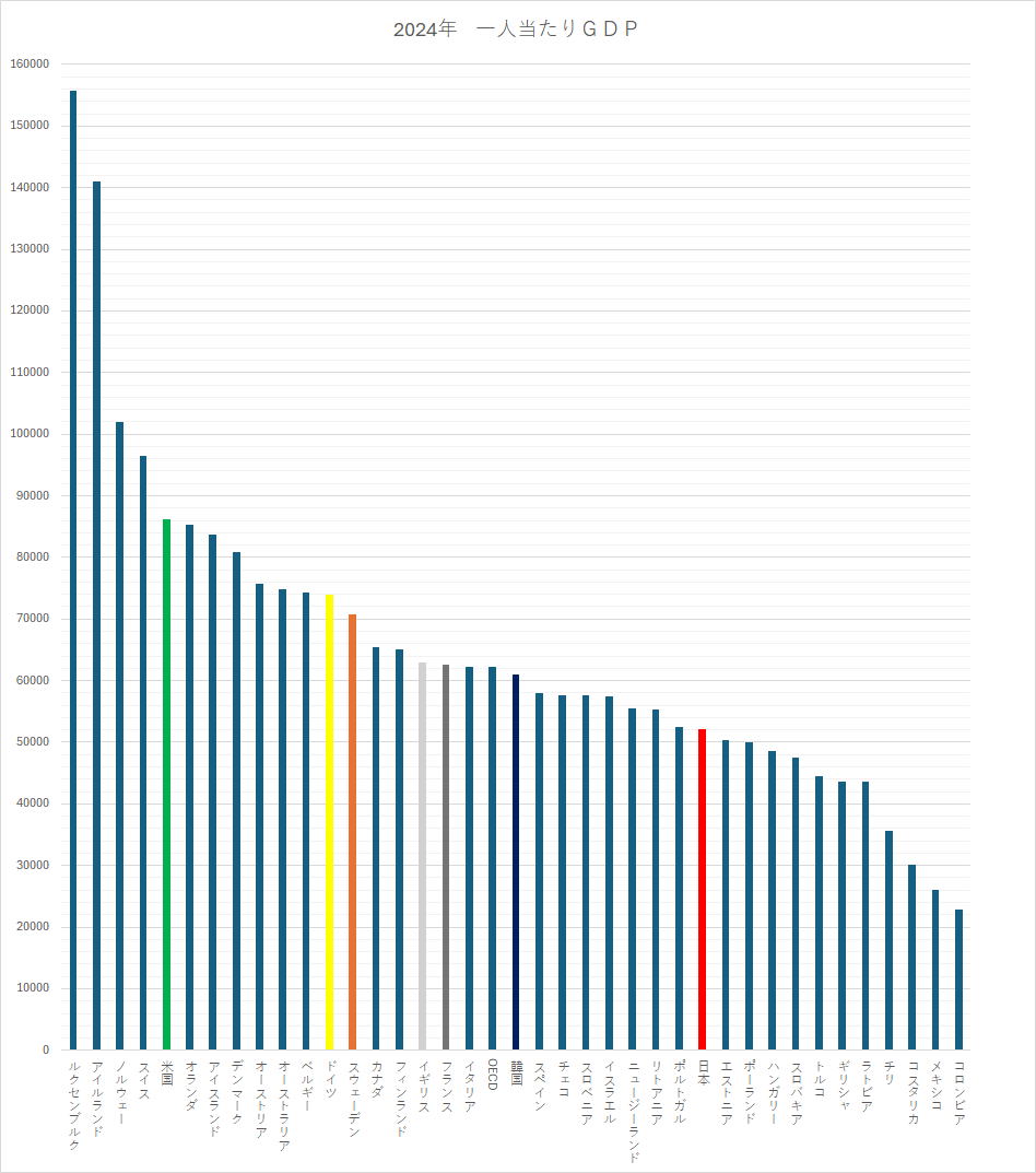 日本の一人当たりGDPの低下(世界27位)が止まらない。2024年のドル円の為替レートは1ドル=151.37円。この30年の推移についてはこちらに詳しいグラフがあります。