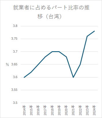 下の図にあるように、台湾ではパートが増えているがそれでも就業者に占めるパート比率は4%を超えていないのだ(雇用者に占めるパート比率は最近のものしかわからないが、2024年5月時点でも3.94%となっている。)。派遣、臨時雇いを含めても7%を超えていない(雇用者に占める割合は2024年で7.8%)。