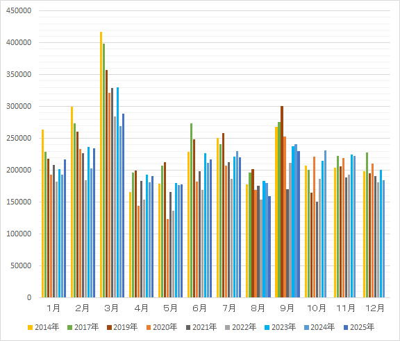 乗用車の国内販売台数(月間)の推移 (2013年1月~2025年9月) 2025年10月7日更新