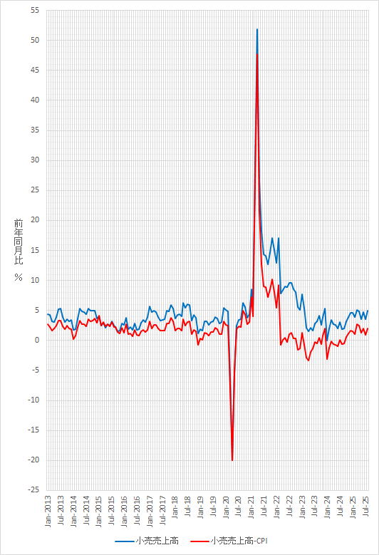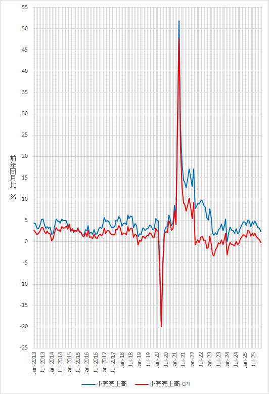 小売売上高(前年同月比)-CPI(前年同月比)の推移(%)