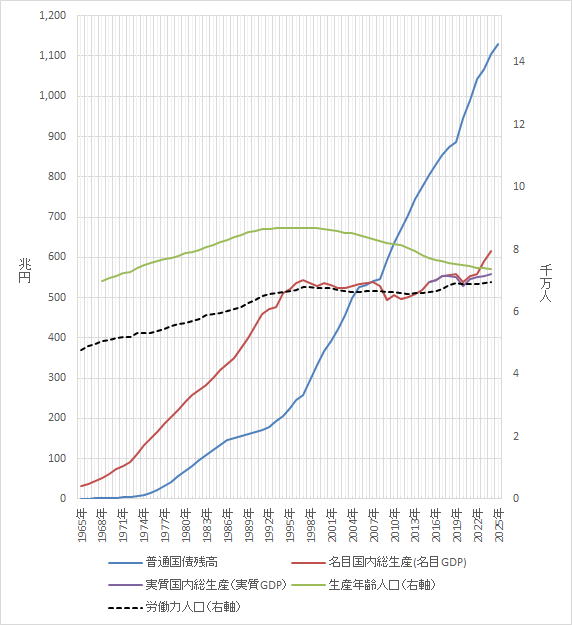 普通国債発行残高、名目国内総生産(GDP)、労働力人口の推移(1965年~2025年)