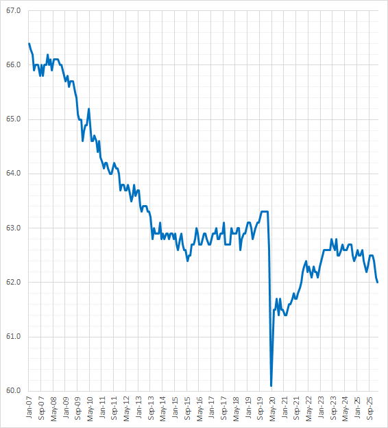 下のグラフから明らかなようにアメリカの労働力率は1990年代にピークをつけた後、長期的に低下傾向にある。その最大の理由は人口の高齢化である。また90年代以降、欧州や日本で育児休暇の充実などがはかられ女性労働力率のアップがみられる一方で、アメリカはこうした流れに乗り遅れ、90年代以降先進国では珍しく女性の労働力率が低下していることも労働力率の低下に寄与している。より詳しい説明はこちらを参考。