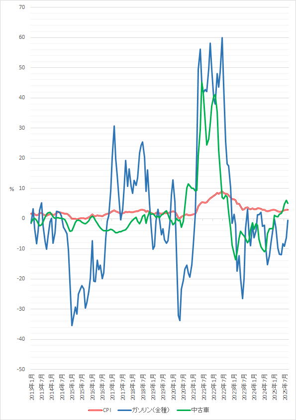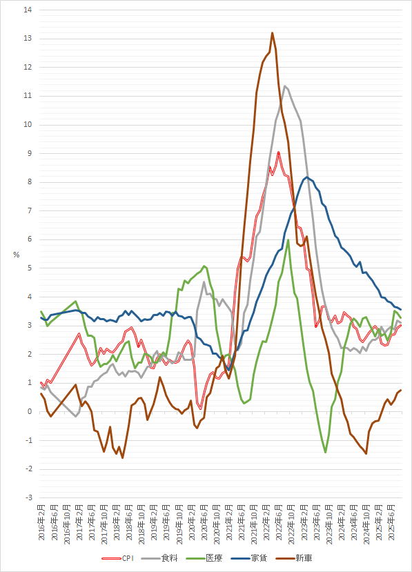 品目別CPI その2(前年同月比%) 2016年1月~2025年9月