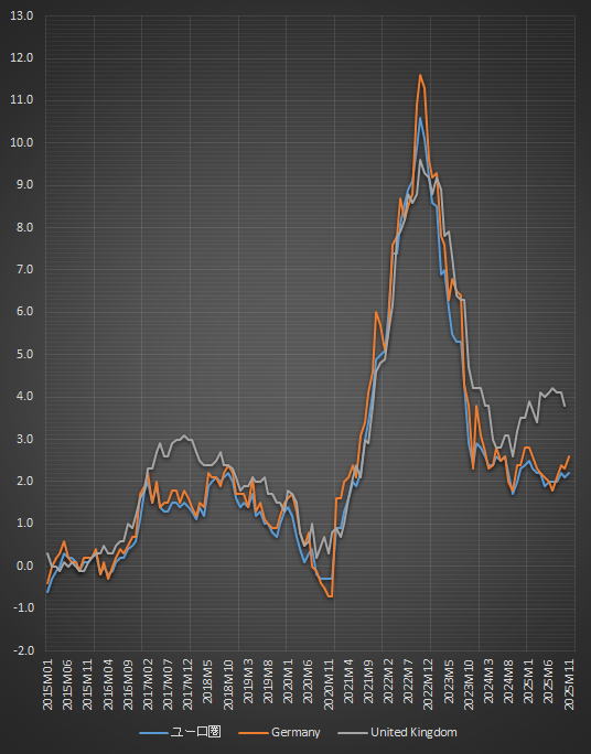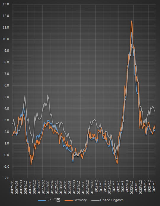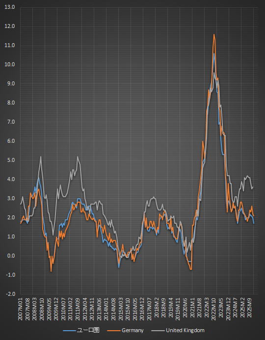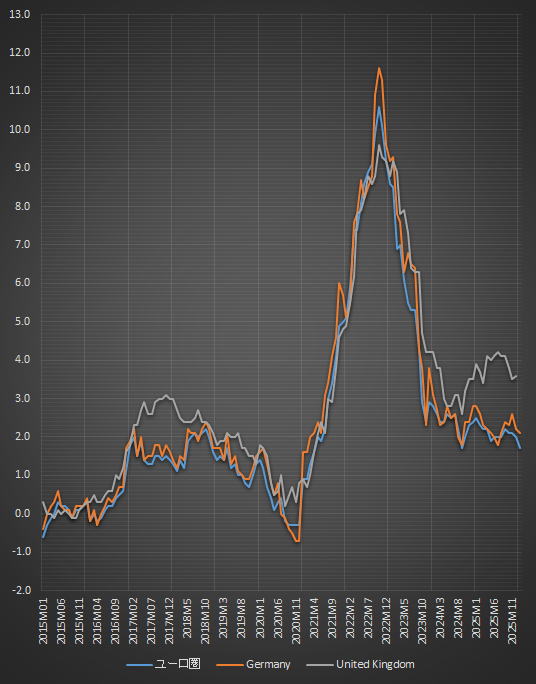 | EU、ユーロ圏、ドイツ、イギリスのインフレ率(HICP) |
