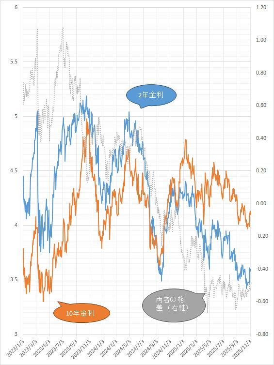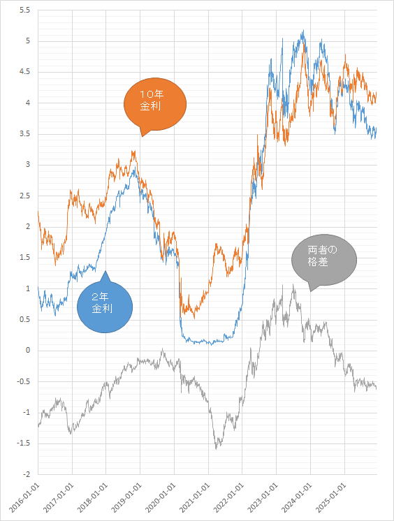 アメリカの長短金利差および長期国債(10年)と2年国債の利回りの推移
